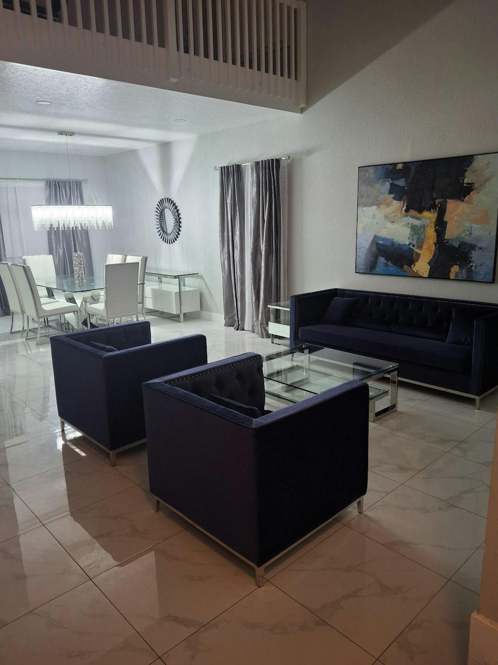 Dominated by a harmonious blend of deep blues, radiant golds, and sophisticated greys, this artwork captures the essence of a cosmic dreamscape. The use of a large vertical canvas adds a sense of grandeur, allowing viewers to immerse themselves in a visual journey that feels like a voyage through the vast expanse of the night sky. It is a testament to the transformative power of art, inviting viewers to get lost in its celestial allure and sparking a sense of awe and inspiration.