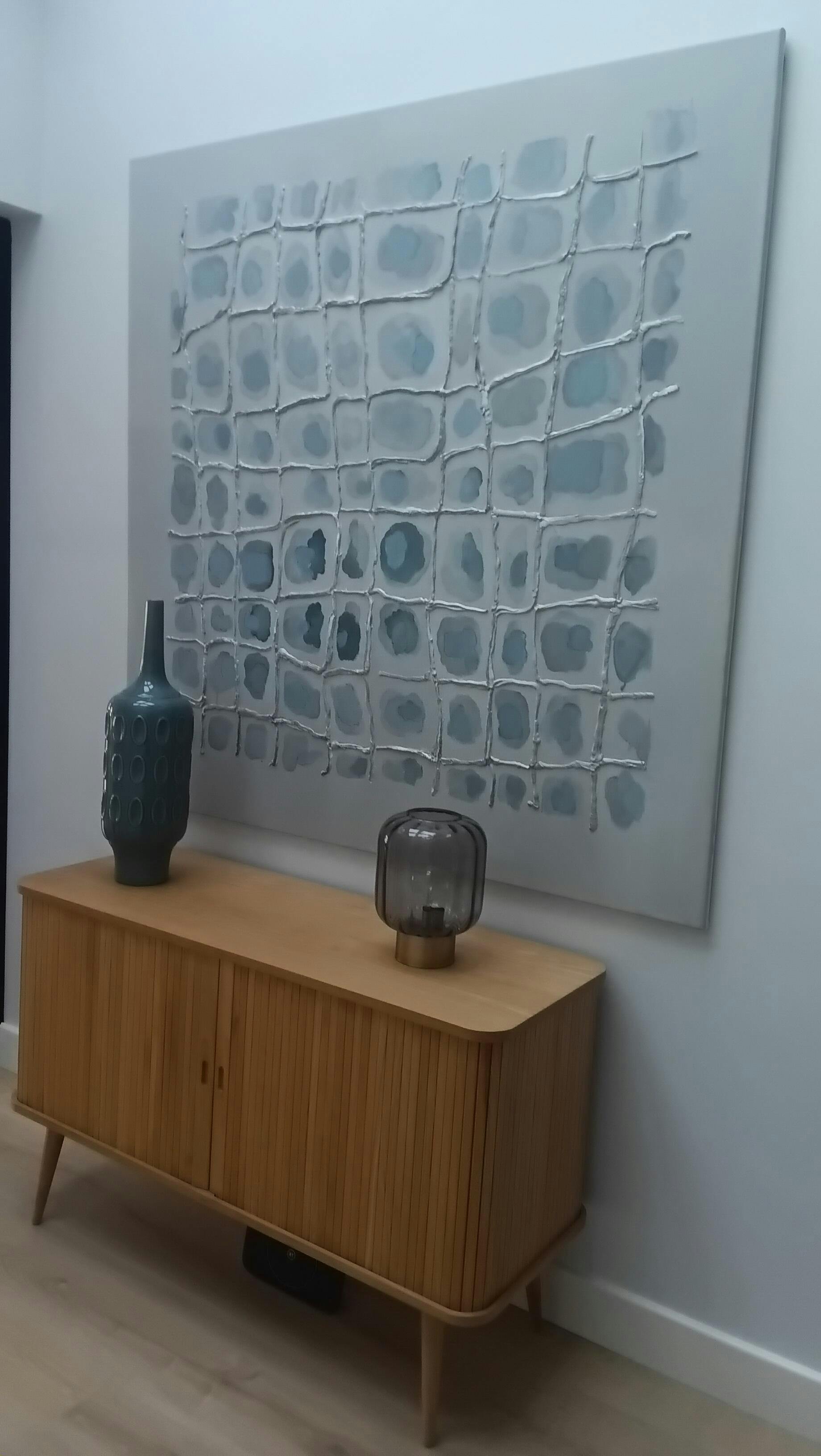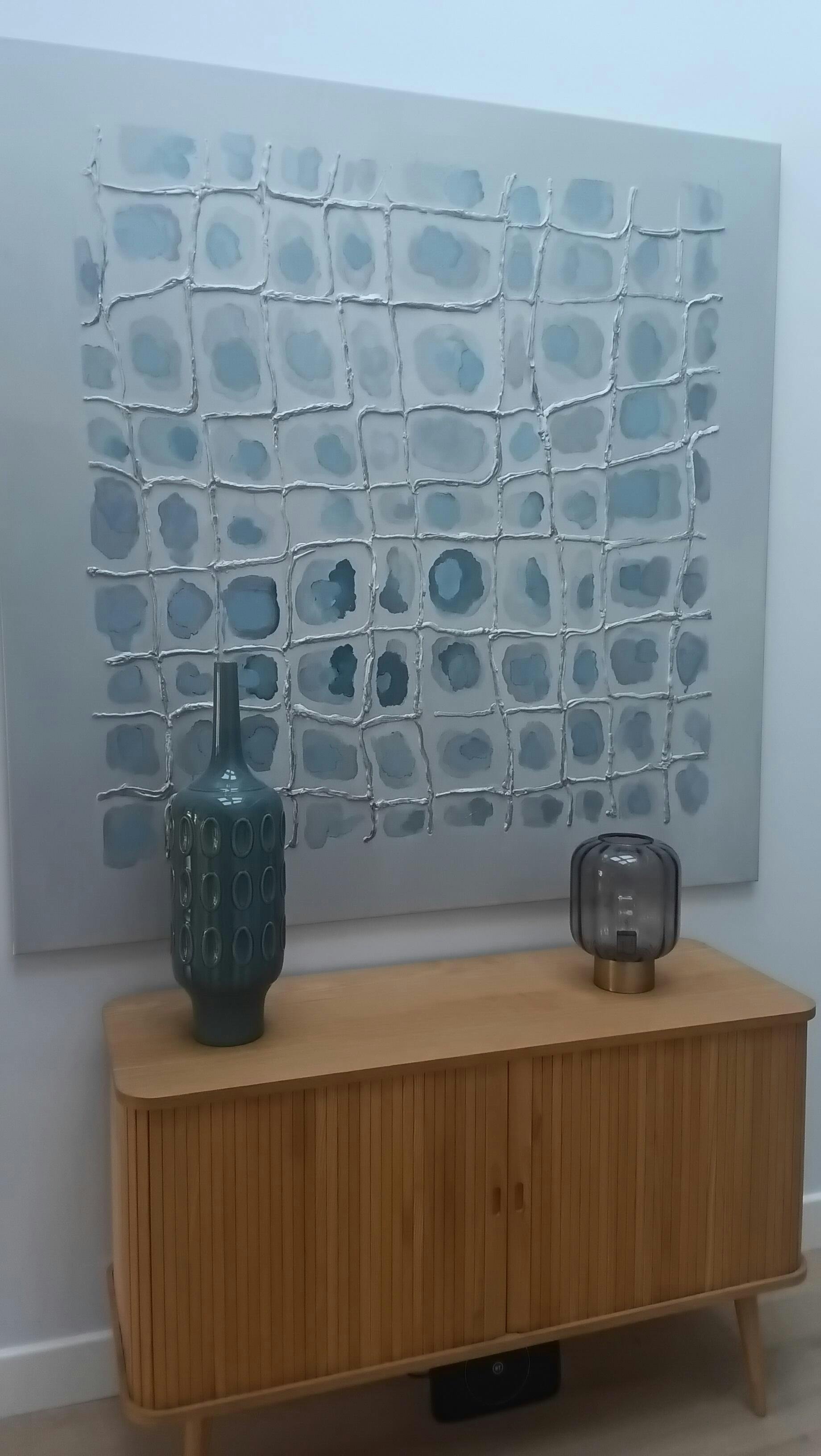 Great painting. Love the texture and the subject is open for interpretation. The background was a bit more light blue than in the website photo. Well executed. Adds a lot of character to the lobby in our apartment complex where we selected a total of 12 paintings from Kline Collective.