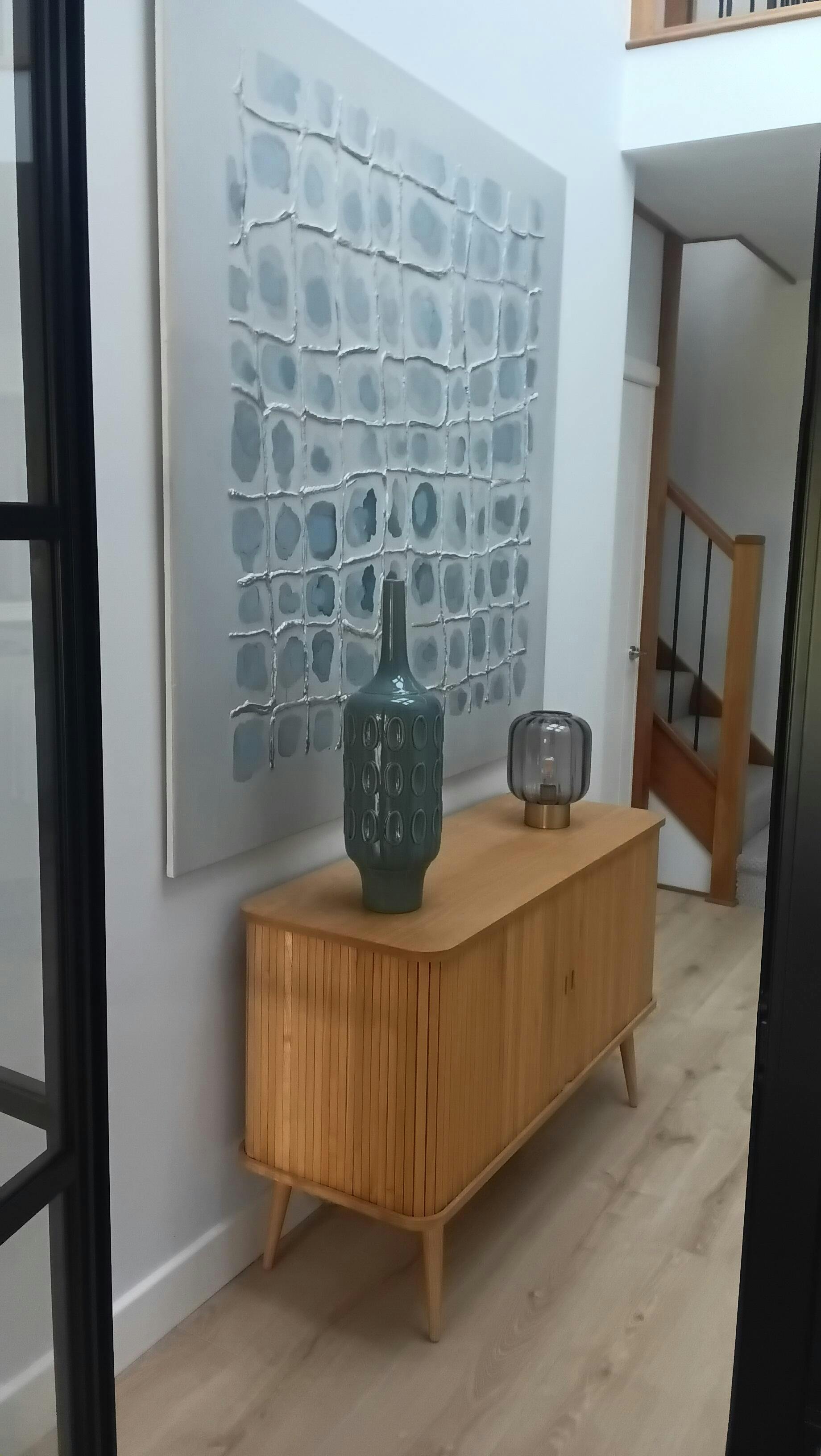 Thank you for your feedback! We’re so glad you love the texture and the painting's character. We appreciate you pointing out the color difference, and we're happy to hear it still works well in your lobby with the other pieces!