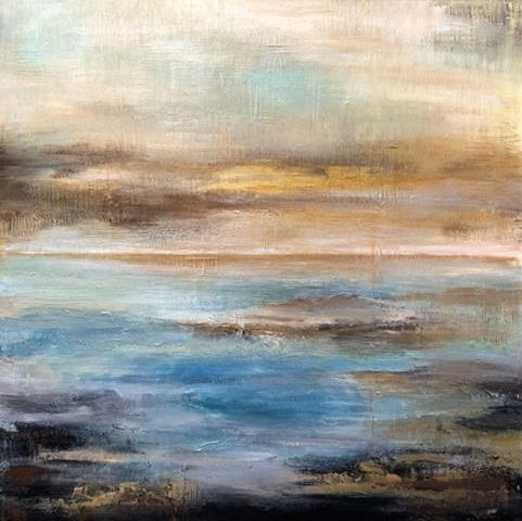 „Abstract Sea and Sky“ ist ein fesselndes Kunstwerk, das den bezaubernden Reiz des Meeres bei Sonnenuntergang einfängt. Mit seinen schimmernden Goldtönen und dem faszinierenden Spiel von Licht und Schatten erinnert das Werk an die ruhige Schönheit des Küstenhorizonts. Jeder Pinselstrich scheint den sanften Tanz der Wellen am Ufer widerzuspiegeln, während das subtile Schimmern des glitzernden Goldes der Szene einen Hauch von Magie und Geheimnis verleiht. Perfekt für ein Haus an der Küste, dient dieses Kunstwerk als atemberaubender Blickfang und lädt den Betrachter ein, sich in der zeitlosen Schönheit von Meer und Himmel zu verlieren.