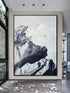 La pintura al óleo con textura de montaña nevada en blanco y negro captura la majestuosa belleza de una cadena montañosa cubierta de nieve, representada completamente en monocromo. Los picos escarpados, con sus líneas nítidas y angulares, se elevan dramáticamente contra un fondo de niebla arremolinada, cada cresta y grieta texturizada con trazos gruesos y audaces de pintura al óleo. La nieve, representada con una textura delicada pero palpable, se adhiere a las laderas de las montañas y cae en cascadas en montículos helados, creando un contraste sorprendente contra los afloramientos rocosos oscuros. Las laderas más bajas, salpicadas de árboles sin hojas y afloramientos escarpados, agregan una capa de complejidad y profundidad a la escena. La ausencia de color realza el juego de luces y sombras, enfatizando la belleza cruda e intacta de las montañas cubiertas de nieve, evocando una sensación de soledad y asombro.