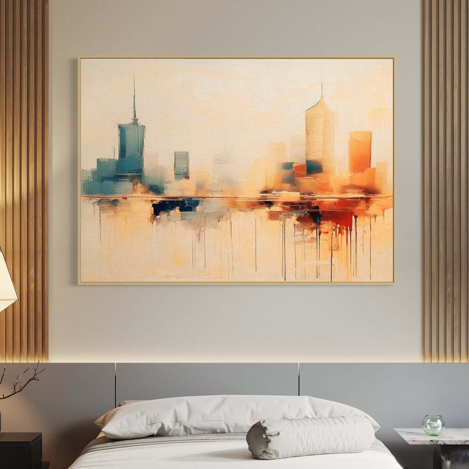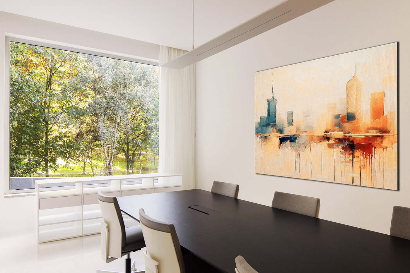 Les bâtiments du crépuscule 5 par l'artiste brésilien Fernando Vieira sont un paysage urbain abstrait captivant qui invite une interprétation sans fin. Avec une palette vive qui capture la lueur du coucher du soleil ou peut-être une brume de fumée et de feu, la pièce donne vie à une ville. Les bâtiments colorés s'élèvent au milieu des teintes atmosphériques, évoquant un paysage urbain animé imprégné d'énergie et de mystère. Chaque coup de pinceau suggère un mouvement, comme si la ville elle-même respire. Laissez votre imagination errer dans le monde vibrant de Vieira et ressentez le pouls de la vie urbaine du crépuscule jusqu'à la nuit.