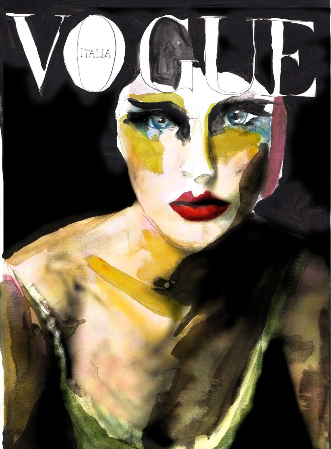 The gallery features 8 Vogue, a large painting of a woman with high fashion makeup, the word VOGUE above vibrant colors on a dark backdrop. Contemporary track lighting strikingly highlights this modern art piece.The 8 Vogue cover showcases a stylized watercolor painting of a womans face, emphasizing her red lips and blue eyes with vibrant colors. Set against a dark background, the bold Vogue title at the top resembles hand-painted wall art.