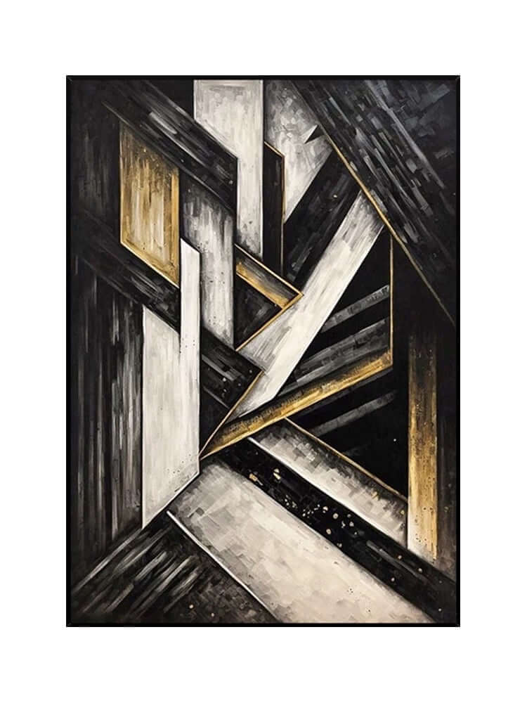 L'arte a parete testurizzata geometrica nera e dorata è un pezzo straordinario e lussuoso che combina le tonalità nere, in avorio e dorate in uno schema astratto affascinante. Questa opera d'arte su larga scala trasuda raffinatezza ed eleganza, rendendola un'aggiunta perfetta a un ampio soggiorno. Le strisce intrecciate di nero e oro creano una composizione visivamente sorprendente e strutturata, catturando l'attenzione e aggiungendo un tocco di opulenza a qualsiasi spazio. La scelta dei colori non solo migliora la bellezza dell'opera d'arte, ma dà anche un'aria di lusso, rendendolo un pezzo di dichiarazione per coloro che apprezzano l'estetica raffinata. Progettata per essere appesa in verticale, questa opera d'arte è su misura per i grandi interni, dove la sua presenza può davvero brillare ed elevare l'atmosfera generale della stanza. La parete testurizzata geometrica nera e dorata è una testimonianza della fusione di espressione astratta e design raffinato, offrendo un'esperienza visiva accattivante per gli appassionati d'arte e gli intenditori interni.