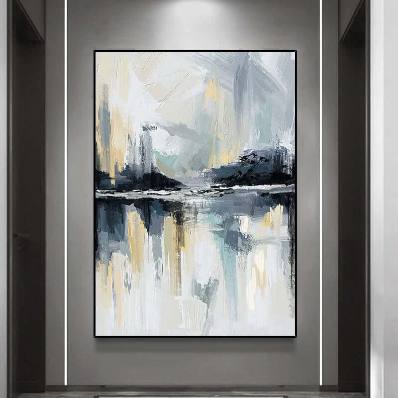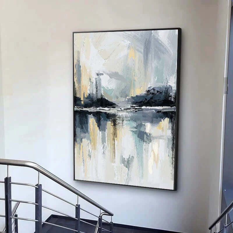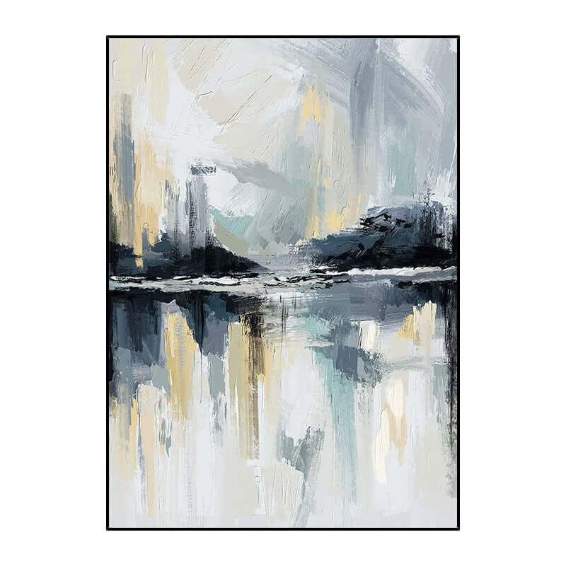 Le tonalità morbide e pastello si fondono perfettamente, imitando la luce sbiadita del giorno mentre riflette dalle acque calme. La composizione astratta invita un senso di tranquillità, come se si potesse quasi sentire la brezza delicata e sentire conversazioni tranquille che vanno alla deriva nell'aria. Le opere d'arte catturano la bellezza dei momenti fugaci e le silenziose riflessioni che ispirano, rendendolo un perfetto omaggio all'abbraccio calmante e pacifico della natura.