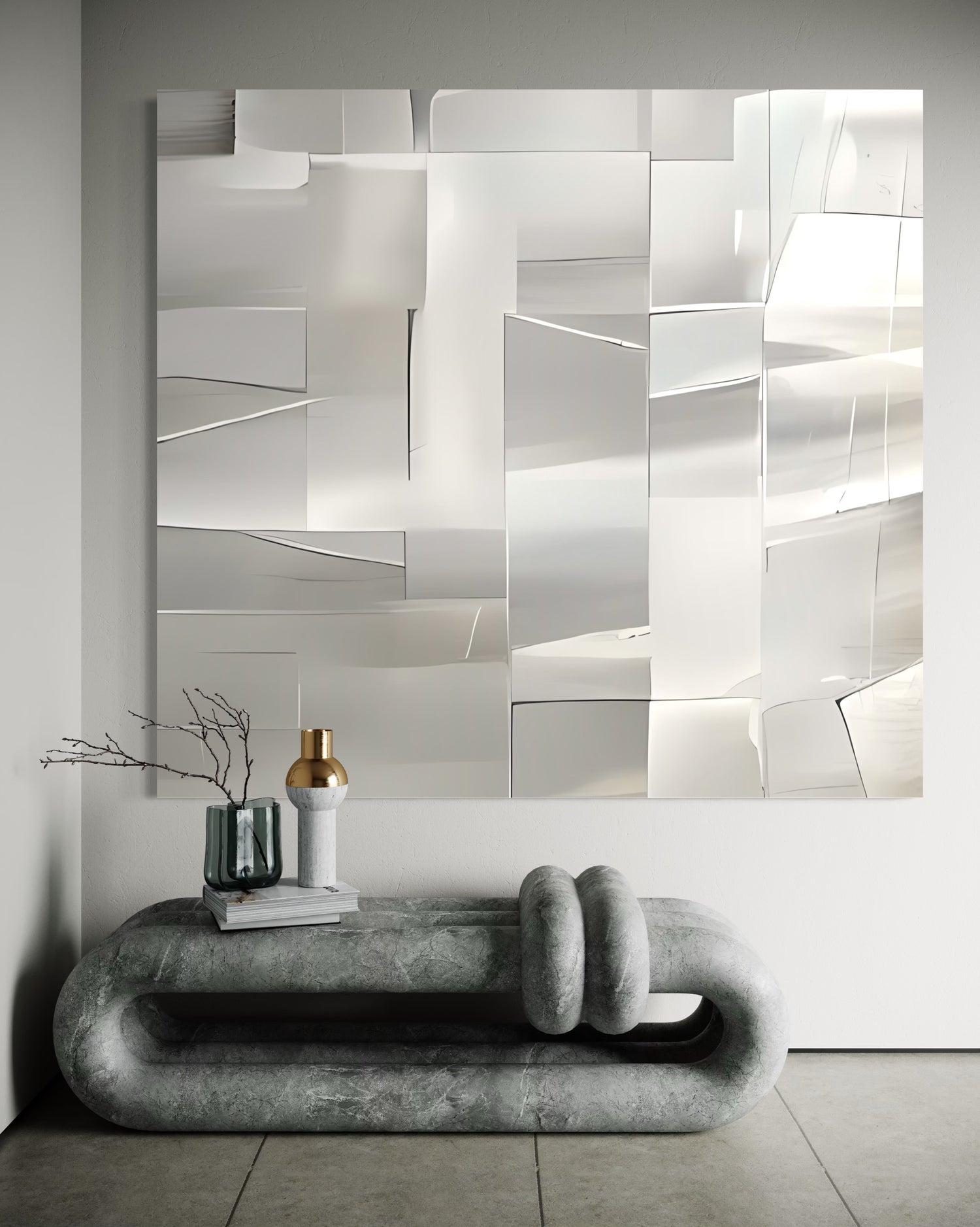 Abstract polished lines wall art featuring light reflections and geometric shapes on a neutral background.